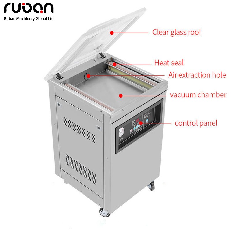 2. Принцип работы: Поместите упаковываемые товары в вакуумный пакет и поместите его в вакуумную камеру, запустите оборудование с помощью панели управления, сначала откачайте воздух из вакуумной камеры до заданной степени вакуума, затем запустите устройство термосварки для завершения процесса герметизации, тем самым осуществляя вакуумную упаковку товаров.