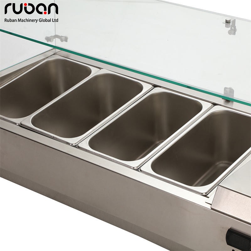 Эта настольная холодильная витрина для салатов со стеклянной крышкой специально разработана для предприятий общественного питания, объединяя функции охлаждения и сохранения свежести ингредиентов, сортировки продуктов и интуитивно понятного отображения. Основной корпус изготовлен из пищевой нержавеющей стали, что обеспечивает гигиеничность и долговечность. Прозрачная стеклянная крышка предотвращает попадание пыли и загрязнений, а многосекционные лотки для ингредиентов удовлетворяют потребности в сортировке продуктов. Точная система контроля температуры поддерживает свежесть ингредиентов, а цифровая панель управления температурой проста в использовании. Компактные размеры позволяют разместить оборудование непосредственно на рабочей поверхности, что подходит для небольших продуктовых магазинов, кафе и других мест, эффективно удовлетворяя двойные потребности в приготовлении и демонстрации салатов.