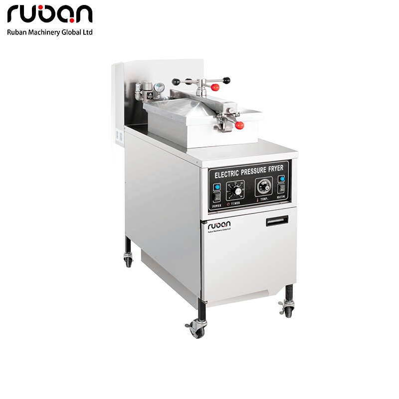 Профессиональная напольная фритюрница высокого давления с алюминиевой крышкой, прочная и простая в эксплуатации. Оснащена тормозными колесиками для удобства перемещения, предохранительным устройством от избыточного давления, электрическим таймером и защитой от перегрева. Надежный сливной клапан для масла, идеально подходит для магазинов и ресторанов, специализирующихся на жареной курице.