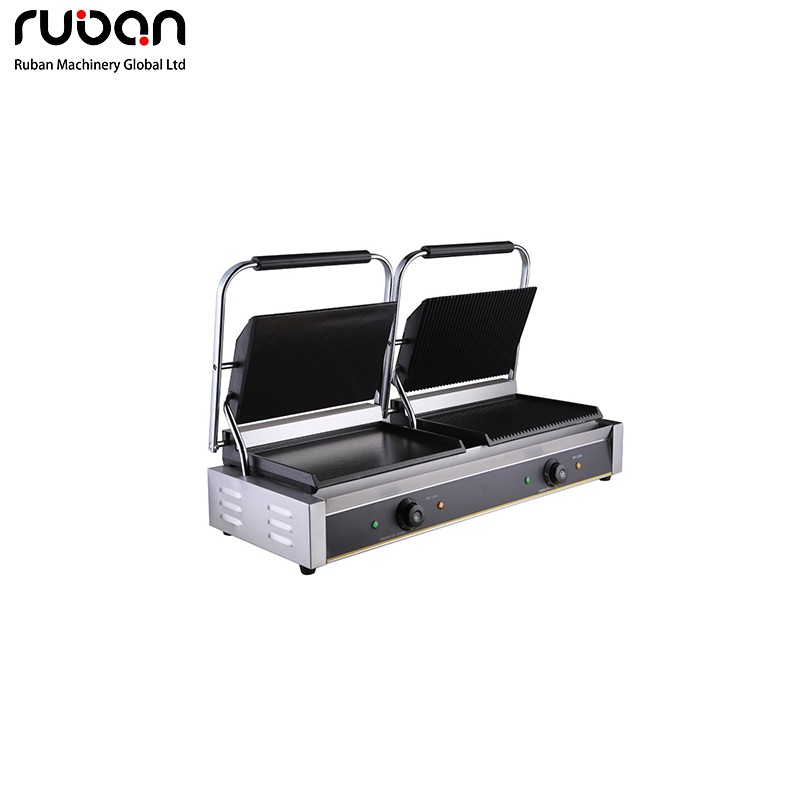 Этот двухзонный промышленный электрический пресс для панини имеет прочный корпус из нержавеющей стали и универсальные чугунные пластины (с рифленой и плоской поверхностью). Благодаря двум независимым регуляторам температуры он обеспечивает равномерный и точный нагрев для одновременного приготовления панини, бургеров и сэндвичей. Компактный, простой в чистке и рассчитанный на большие объемы использования, он идеально подходит для ресторанов, кафе и фудтраков.