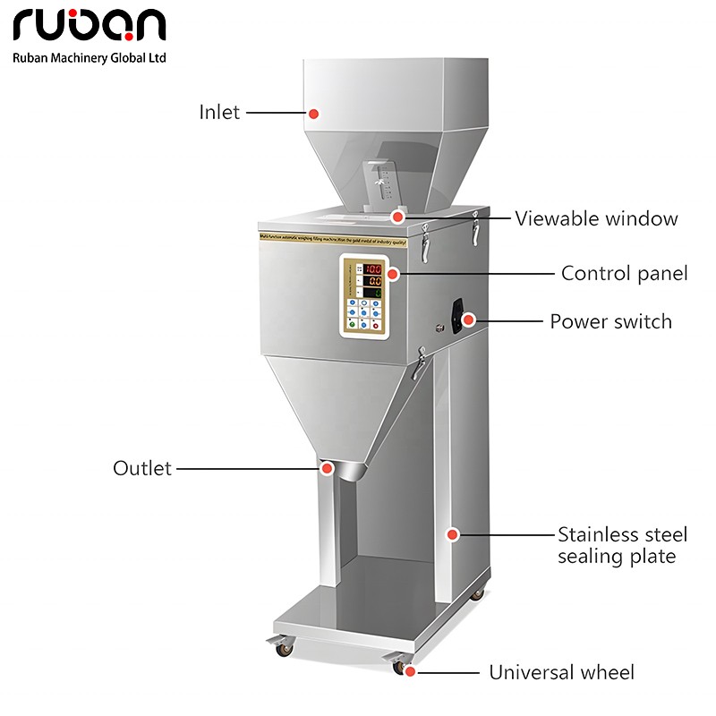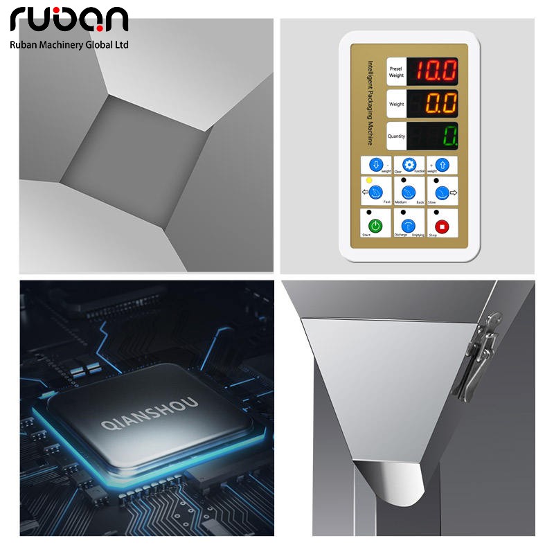 Эта фасовочная машина имеет вертикальный металлический корпус, оснащена интеллектуальной панелью управления и бункером большой емкости, а также колесиками внизу для удобства перемещения. Она подходит для количественного фасовывания порошкообразных и гранулированных продуктов размером до 2 см и может работать с различными материалами, такими как зерновые и злаки, приправы и пластиковые гранулы. Это автоматизированное фасовочное оборудование для таких отраслей, как пищевая промышленность, химическая промышленность и производство металлоизделий.